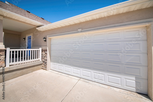 Front exterior of a garage with closed white panel door