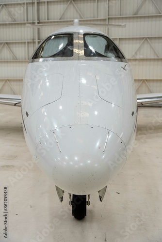 Front of a white private jet in a hangar.