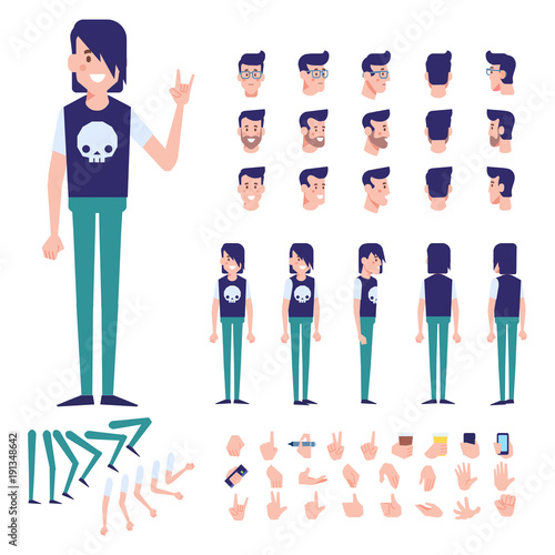 Front, side, back view animated character. Teenager boy character creation set with various views, hairstyles, face emotions, poses and gestures. Cartoon style, flat vector illustration.