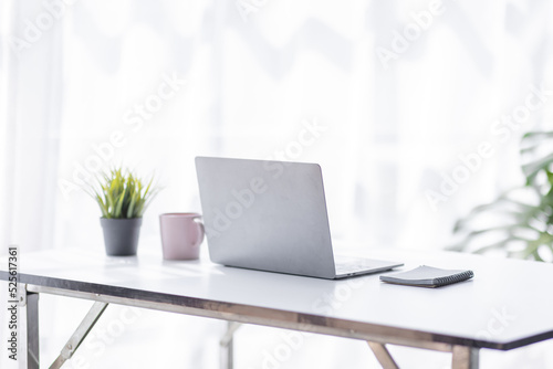 Front view Contemporary business workspace, Workspace Laptop screen, Laptop Computer on office desk. Blurred background.