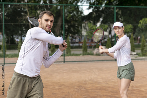 Front view couple playing tennis