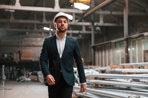 Front view. Manager in black formal wear at the factory