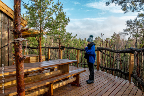 Front view of a girl at the top of a treetop wooden cabin glamping drinking some tea in the exterior with a beautiful view of the forest from the heights.