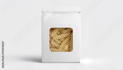 Front view of a white cardboard box featuring a spiral pasta window. Mockup collection of packaging templates with included clipping path.