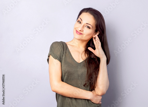 Front view of beautiful natural woman with nude makeup and natural smile looking with folded arms in casual greet t-shirt clothing on puple background with empty space. Closeup
