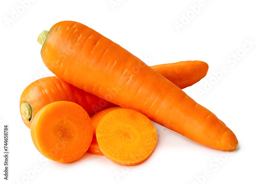 Front view of beautiful orange carrots with slices in stack isolated on white background with clipping path