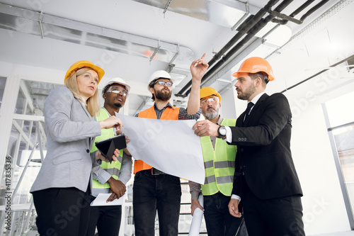 Front view of good-looking multiracial confident successful male and female engineers and architects, standing indoors at counctruction site and discussing details of project
