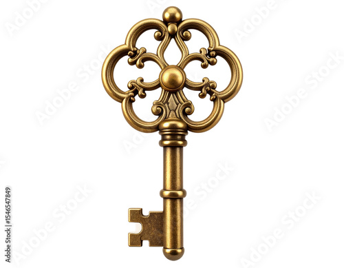 Front View of Ornate Vintage Skeleton Key with Polished Brass Finish, Isolated on Transparent Background