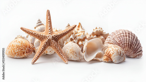 front view of sea shells and starfish on isolated white background.ai