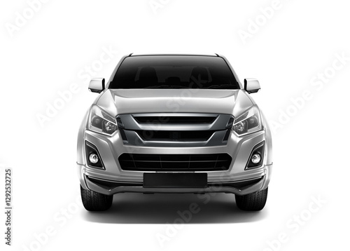 Front view of silver colour pickup truck Isolated on white background. 3D rendering.