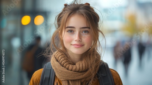 front view of young woman with backpack on a blurred street background
