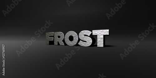 FROST - hammered metal finish text on black studio - 3D rendered royalty free stock photo. This image can be used for an online website banner ad or a print postcard.