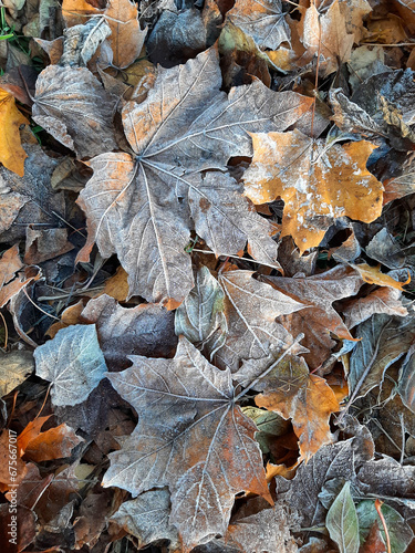 frost on autumn leaves fallen to the ground