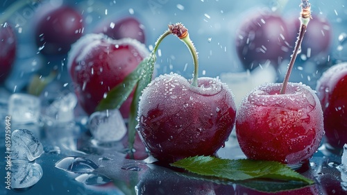 Frost-coated cherries with ice and frozen droplets