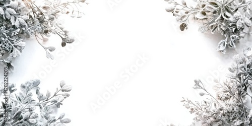 Frost-covered branches elegantly frame an empty space, ideal for adding winter-themed messages or decorative elements suitable for the season