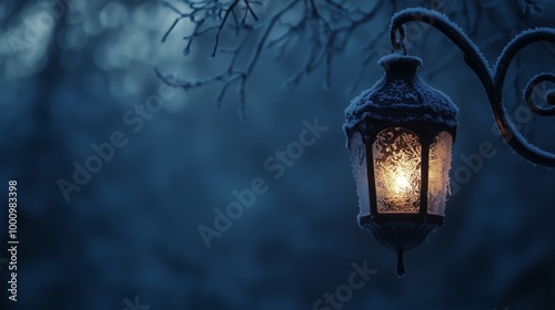 Frost-Covered Lantern Hanging from Wrought Iron Hook Against a Dark Winter Night Sky