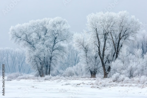 Frost-covered trees by a snowy river in a wintry landscape during early morning light