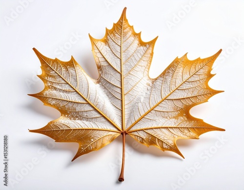 Frost-dusted golden maple leaf with clear vein texture, lying flat on a white surface