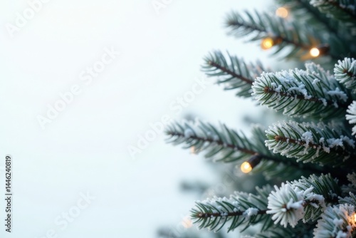 Frosted branches of a Christmas tree against a white background, winter wonderland, trees, stillness
