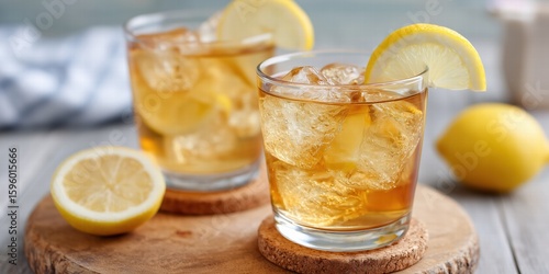 Frosted Iced Tea Glasses with Lemon Slices, Condensation on Glass, Round Wooden Table and Cork Coasters, Summer Beverage Still Life, Top View