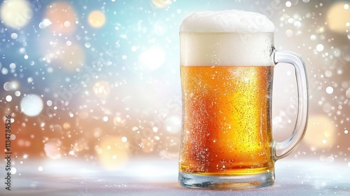 Frosty Beer Mug with Foam and Droplets Surrounded by Soft Bokeh Lights in a Cheerful Atmosphere Perfect for Celebrations and Gatherings