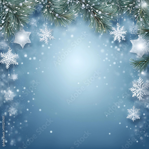 Frosty Border with Snow-Covered Pine Branches, Icy Snowflakes, Silver Ornaments, and Glowing Fairy Lights