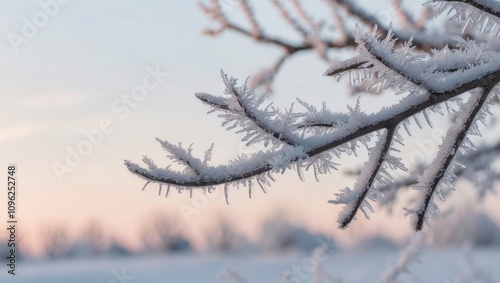 Frosty branches glisten in the morning light at dawn.