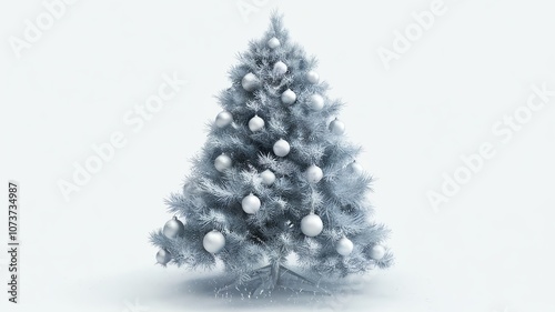 Frosty Christmas tree with snow-covered branches and white ornaments on white background.