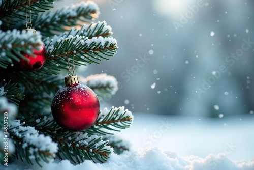 Frosty evergreen tree with red glass ornaments on snowy backdrop, winter, evergreen
