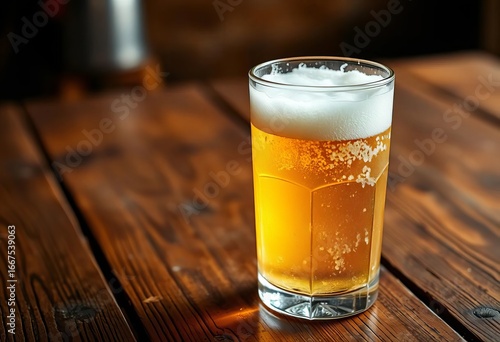 Frosty glass of light beer with condensation on a rustic wooden table, foam, close up