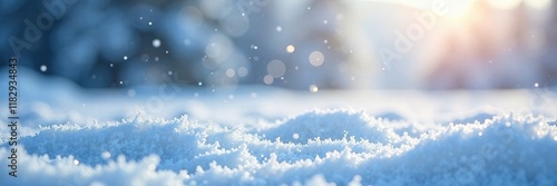 Frosty landscape with snowflakes falling gently in white light, serene, calm, ice