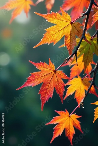 Frosty maple branches with vibrant autumn colors, green, maple, orange
