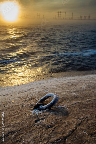frosty pier against the background of waves in the foggy sunrise