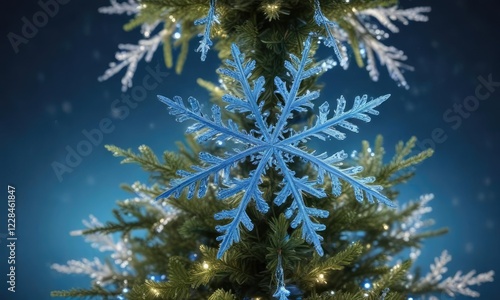 Frosty snowflake Christmas tree with sparkling lights on a blue background, frozen beauty, sparkly lights, holiday decoration