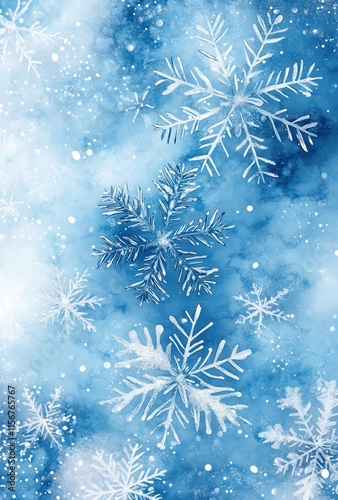 Frosty Snowflakes Falling Against a Light Blue Winter Background with Soft Bokeh Effects, Perfect for Seasonal Holiday and Winter-Themed Designs