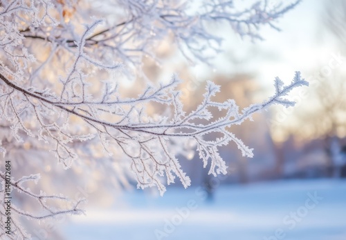 Frosty Tree Branches Glimmering in Winter Sunlight, Capturing the Beauty of Nature's Icy Artwork in a Serene Snow-Covered Landscape