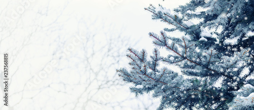 Frosty winter landscape in snowy forest. Pine branches covered with snow in cold winter weather. Christmas background with fir trees