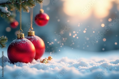 Frosty winter scene with red and gold balls suspended in mid-air, sparkle, decorations