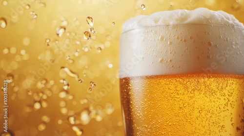 Frothy beer in a glass against a golden background with bubbles.