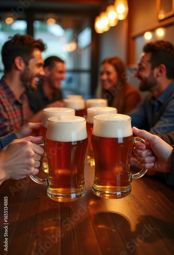 frothy beer mugs rustic pub table lively atmosphere cheerful gathering toasting celebration craft brews foam refreshment cheers, glass, drink, ale, brewery, suds