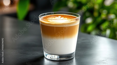 Frothy milk top of a latte in a clear glass cup on a dark table,coffeehouse vibes