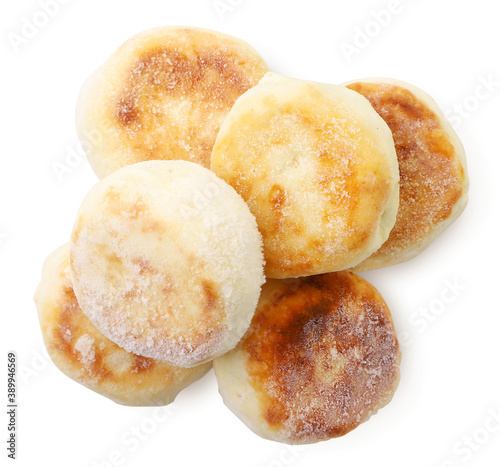Frozen cheese pancake on a white background, isolated semi-finished products. The view from top