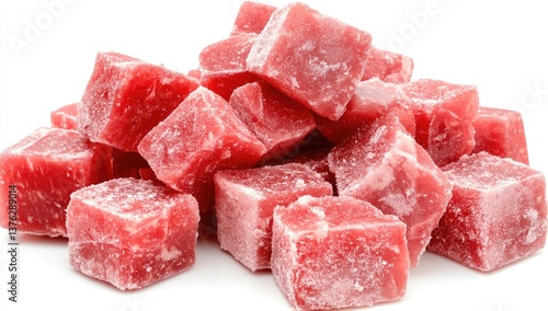 Frozen cubed beef. A pile of small, uniformly sized, frozen meat cubes.
