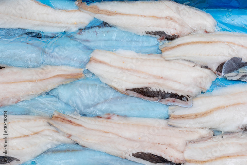 frozen fish Longtail hake in a box. Packaging with interleave plastic film and fish. Argentine tradel fish, after primary processing on a trawler, is ready for sale