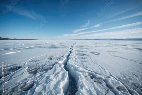 Frozen Lake Crack Extending Infinitely Across the Ice in Winter Tourism
