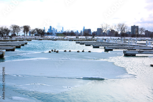 frozen Lake Michigan with Chicago skyline in winter