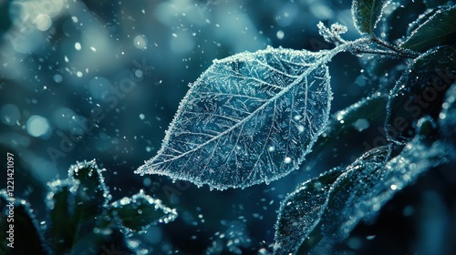 Frozen leaf, winter snowfall, bokeh background, nature scene