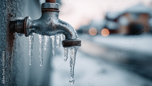 Frozen outdoor faucet in winter. Icicles hang from a metal tap, against a backdrop of snow and blurred houses