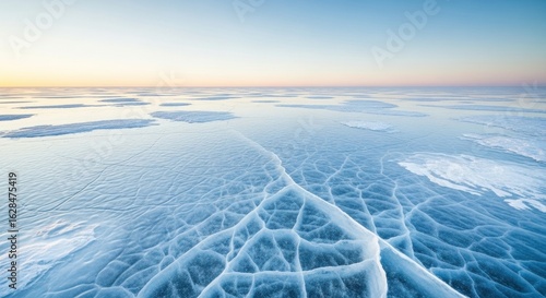 Frozen panorama showcases intricate ice fractures beneath a soft pastel sky during sunrise