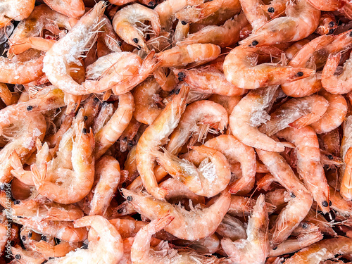 Frozen shrimps prawns. Raw shrimp background. Pile of frozen shrimps background.